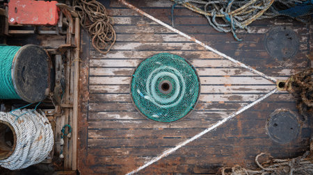 fishing gear and equipment on trawlers deck at dusk, created with generative ai