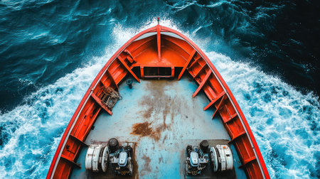 A cargo ship, viewed from a high angle, sails through rough ocean waters. The image captures the vessel's deck and containers. The color palette includes shades of red, gray, and turquoise, creating a contrast. This image could be used for illustrating transportation, shipping, or the environment.
