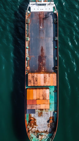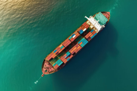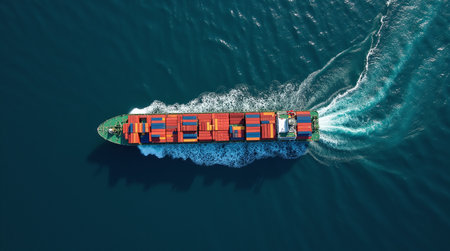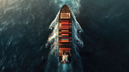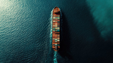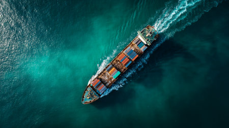 Aerial top view of a container ship navigating global shipping lanes, essential maritime logistics