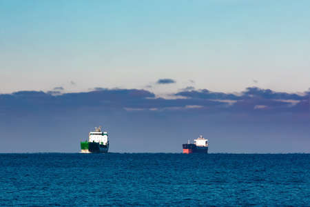 Cargo ships waiting on the sea to passing a canal or strait. Transportation background photo.