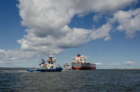 Industrial seaport Novorossiysk , top view. Bulk carrier, Multipurpose or General cargo enters the port using tugs