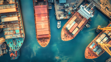 An overhead shot presents several cargo ships laden with vibrant shipping containers. The composition features diverse colors and patterns, suggesting international trade. The overall style appears commercial, potentially suitable for visuals related to logistics, transportation, or global commerce. This image is suited for various commercial and editorial applications.
