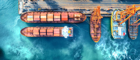 This aerial image captures a vibrant commercial port with cargo ships and tugboats maneuvering through calm waters, illustrating the dynamic world of maritime trade and shipping logistics.