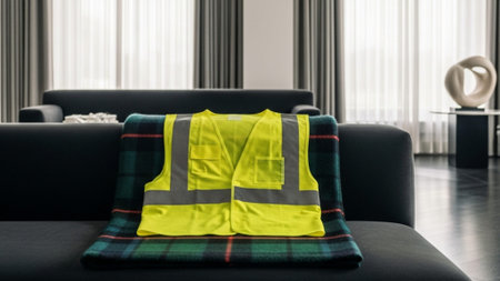 A bright yellow safety vest displayed against a black background, emphasizing its high visibility and essential role in construction and outdoor work.