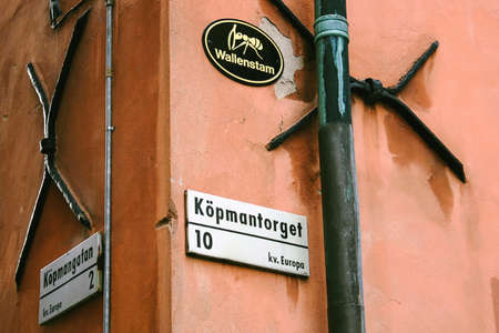 A street sign with the name Landbygatan is mounted on a red brick facade on an old building in the old town of Malmö, Sweden