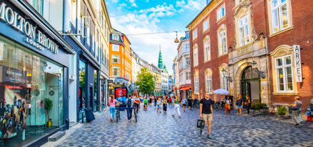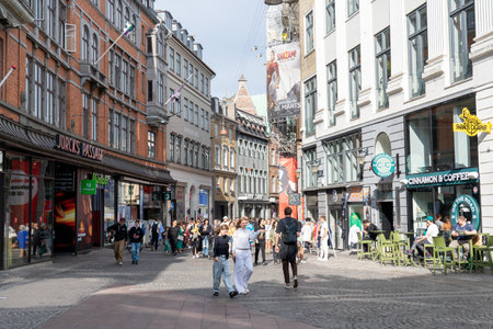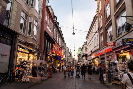 Copenhagen, Denmark - August 26, 2019: Shopping street called Stroget with clothing stores and restaurants with people around in the center of Copenhagen, Denmark