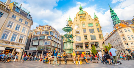 Copenhagen, Denmark - 20 June, 2020: Sunny evening on Amagertorv Square and Stroget street in old town
