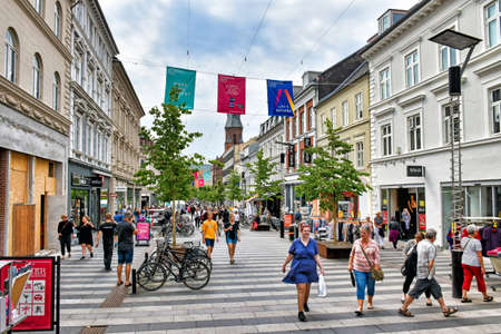 Aarhus, Denmark? July 20, 2017: People stroll along the shopping mile at Ryesgade in the center of the Danish town of Aarhus. Ryesgade is one of Denmark's busiest commercial pedestrian zones.