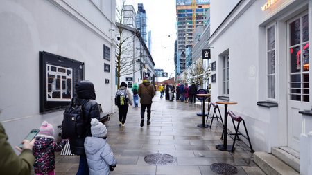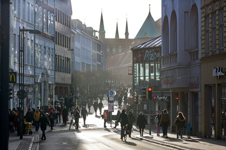 Lubeck, Germany, January 15, 2022: Crowd of people in backlight walking along the shopping street in the city center of the historic old town, selected focus, narrow depth of field