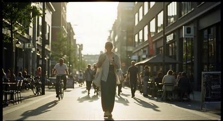 A woman walks down a bustling city street on a sunny day