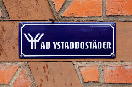 Ystad, Sweden - April 15, 2017: The property owner AB Ystadbostader sign attached on red brick wall.