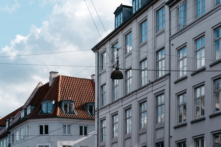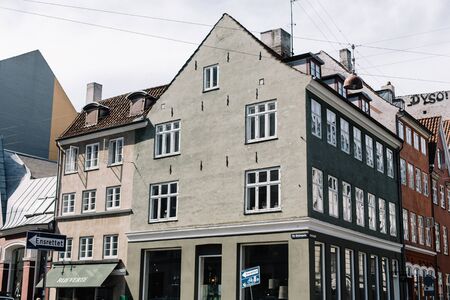 Copenhagen, Denmark - August 11, 2016. Low angle view of residential buildings and church in historical city centre of Copenhagen a cloudy day of summer
