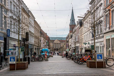 Aarhus, Denmark - 24 march 2020: Ryesgade in Aarhus also known as the pedestrian street in the city center, People on the street, shops on both sides. Catholic Church on the right. the railway station in the background