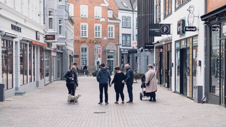 ELSINORE, DENMARK - APRIL 30, 2016: The almost deserted pedestrian street, on a saturday afternoon, with a large group of people