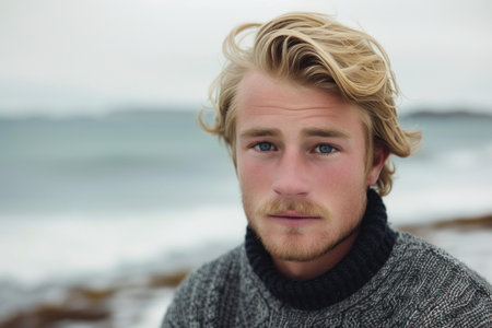 Handsome blond man in a grey sweater poses thoughtfully by the sea