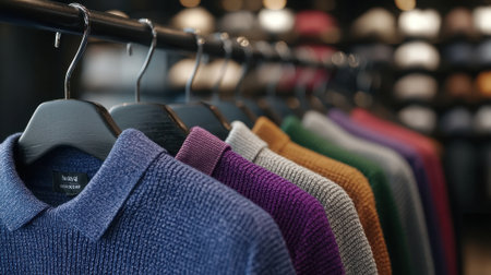 Closeup of woolen pullover collection on hangers in a fashion store showroom