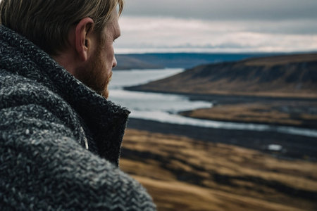 Bearded man in a warm sweater on the background of a picturesque landscape of Iceland