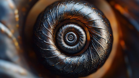 A mesmerizing close-up of an intricately detailed shell showcasing a spiral pattern. The mix of golden and black hues creates a striking visual effect, highlighting nature's beauty.