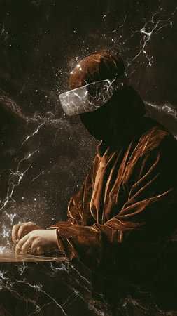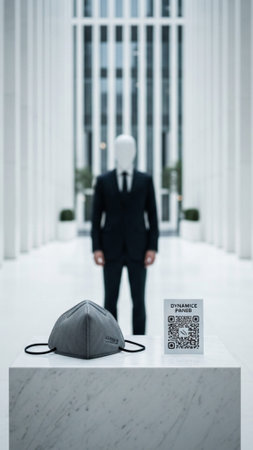 A striking vertical, full-body composition showcasing the mandatory protocols of the contactless era