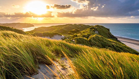 View showing sunlit coastal dunes with green grass and ocean under dramatic sky keywords: sun, sand dunes,...