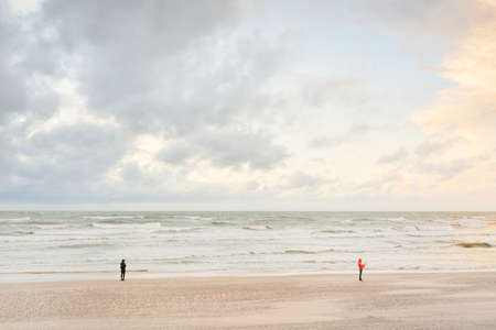 Baltic sea shore at sunset. Beach, sand dunes. Clear sunset sky, glowing clouds. Lonely people walking with a mobile phones. Local travel, eco tourism, mental health, social issues and distance themes