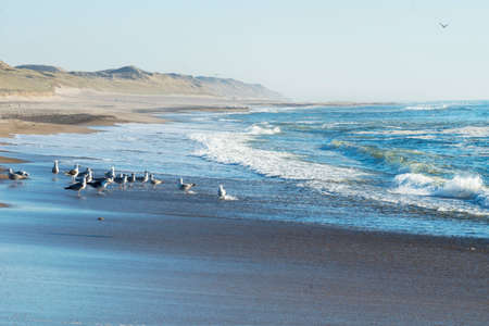 Large sand beach and sea wave in sunny day under blue clear sky at Dutch north sea coast,for summer .