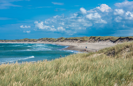 Hilly coast of the northern sea. Sun, blue sky, clouds, waves and grass. Beautiful landscape summer on the northern sea. Danish Coastal Landscape