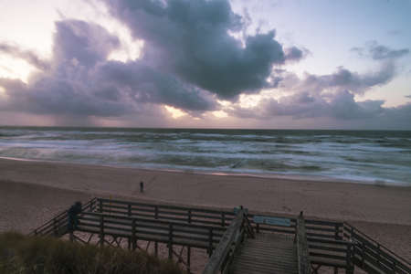 Panoramic view of Baltic sea from sandy shore, sand dunes. Dramatic sky with glowing clouds, sunbeams. Denmark