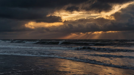 Sand on the beach at sunrise on the ocean with waves and spray in the morning