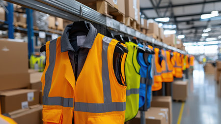 A row of orange and yellow safety vests hang on a rack. The vests are bright and eye-catching, indicating that they are meant to be easily seen and worn by workers in a warehouse or industrial setting