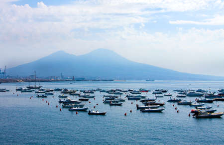 Sailboats, boats and yachts moored on the gulf of Naples in front of the Mount Vesuvius, Italy