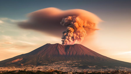 Imagination of Campi Flegrei caldera eruption in Italy. Generative AI.