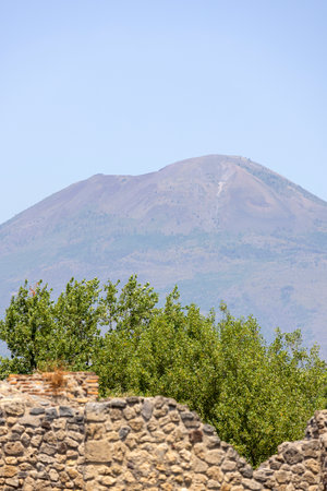 Ruins of an ancient city destroyed by the eruption of the volcano Vesuvius in 79 AD near Naples, Pompeii, Italy. Mount Vesuvius in a background