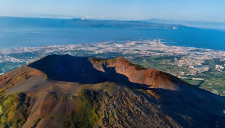 Naples, Italy - 04.28.2025: View from the top of the Vesuvius volcano to the hazy Tyrrhenian Sea and coastal cities.