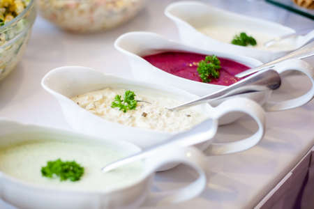 Reception buffet tables with regional food from Poland. Luxury concept