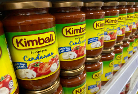 KUALA LUMPUR, MALAYSIA - APRIL 15, 2020 : Spaghetti mushroom sauce brand Kimball display on the shelf at supermarket.