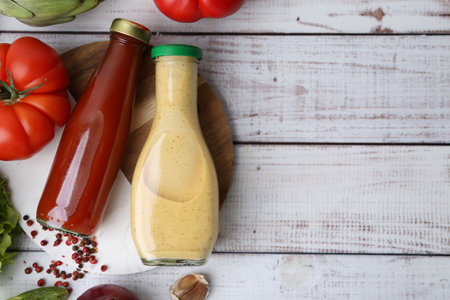 Tasty sauces in glass bottles and fresh products on white wooden table, flat lay. Space for text