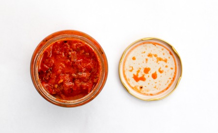picture of a Traditional Macedonian food. Luteniitza in an open jar . homemade product,top wiev