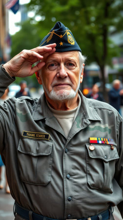 Veteran salutes during a parade commemorating military service in a busy city street