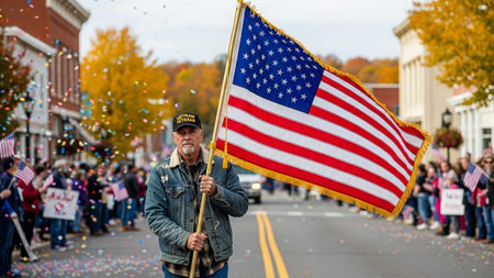 Honoring veterans at a parade with gratitude in a vibrant downtown setting during a clear autumn day