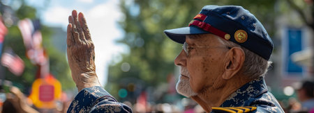 A respectful elderly veteran in military uniform salutes the American flag in a solemn Memorial Day ceremony, embodying patriotism and honor
