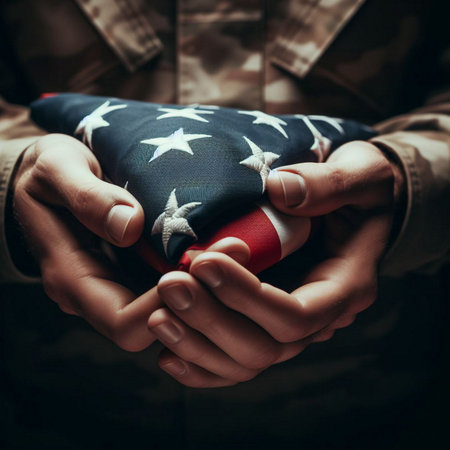 A veteran's hands hold a folded American flag, a symbol of patriotism and sacrifice.