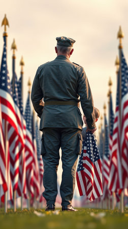 Soldier stands proudly with child among rows of American flags during sunset at a memorial site honoring veterans
