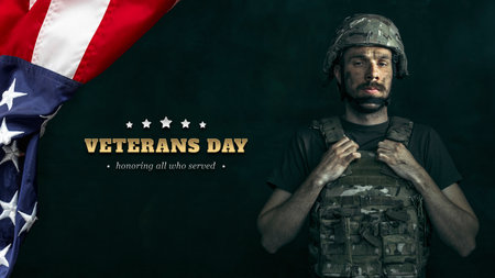 Veterans Day national holiday in United States on November 11, anniversary end of World War I, armed forces. flag uniform camouflage, award medal badge. banner, copyspace, background, greeting card