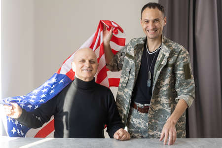 AI Generative Old men in military uniforms on background of the USA flag Remembrance Veterans Day