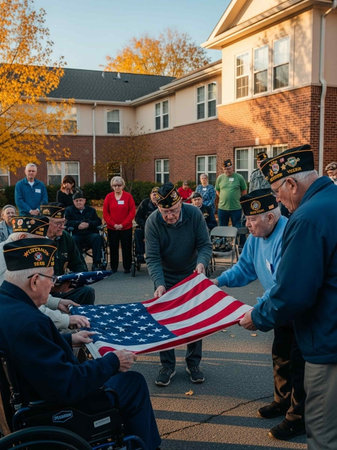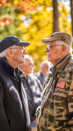 Smiling veterans with flags behind, proud community moment, Veterans Day tribute, outdoor patriotic scene