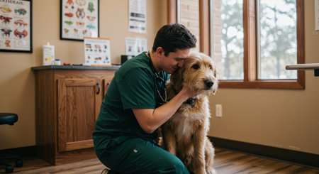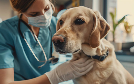 Veterinarian in blue scrubs is gently examining golden retriever dog in a modern clinic, highlighting the caring relationship between animal and professional