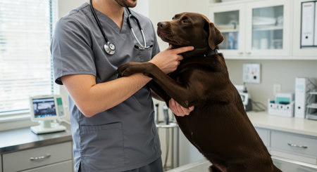 Veterinarian in grey scrubs examines a chocolate Labrador dog in a clinic. The vet is holding the dog paws and neck during the checkup in an office.
