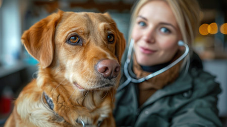 A veterinarian pet dog clinic examination stethoscope caring veterinarian gently examines relaxed dog examination table showing compassionate
