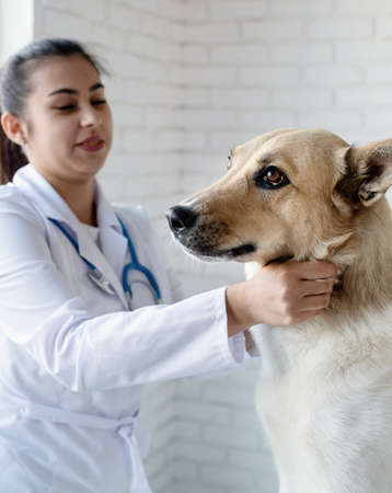 Caucasian female vet examine the dog in the office